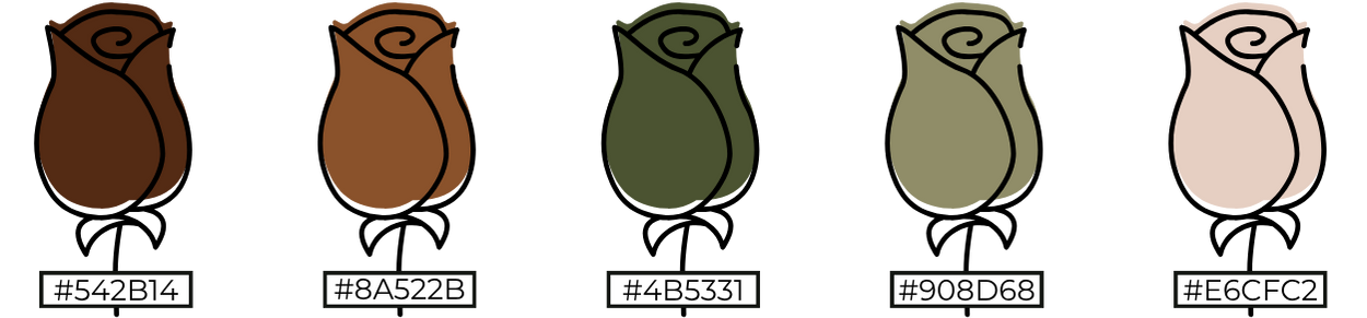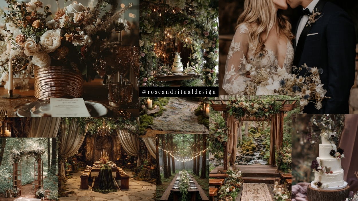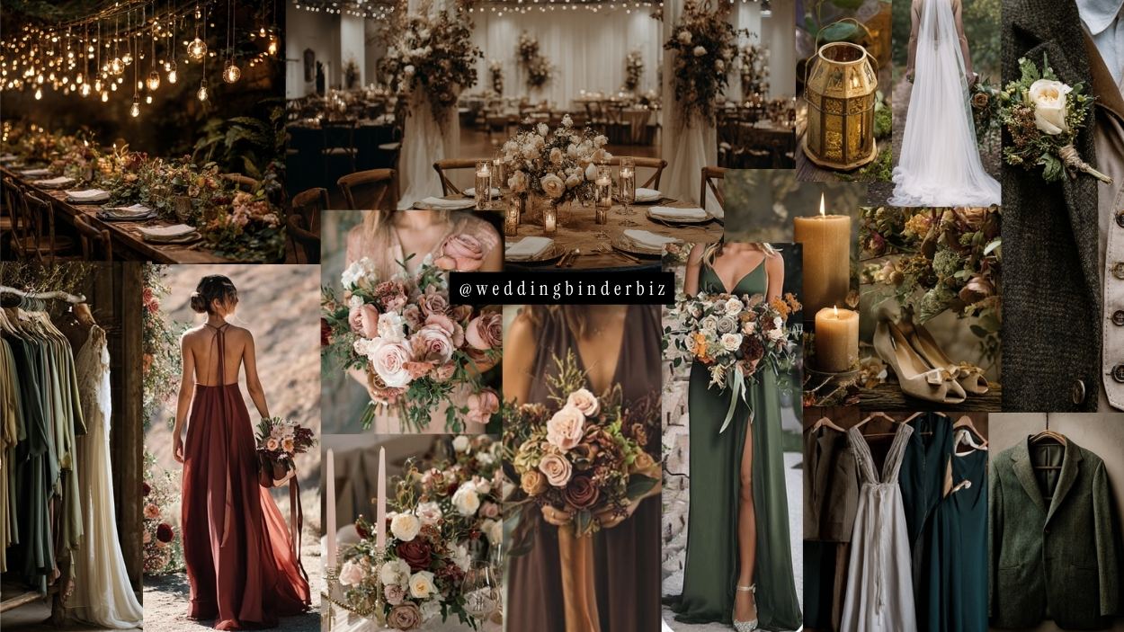 Rich, grounded, and a little bit magical – this palette feels like it was made for the heart of the forest. Moss green, soft olive, and espresso brown set the tone, while creamy neutrals and a hint of gold and sparkle (hello, fairy lights!) bring the cozy glow. It’s the perfect mix of earthy and romantic – like saying “I do” in your own secret woodland. If you’re drawn to candlelit paths, vintage lanterns, wildflowers, and that warm, rustic charm, this one’s going to steal your heart.